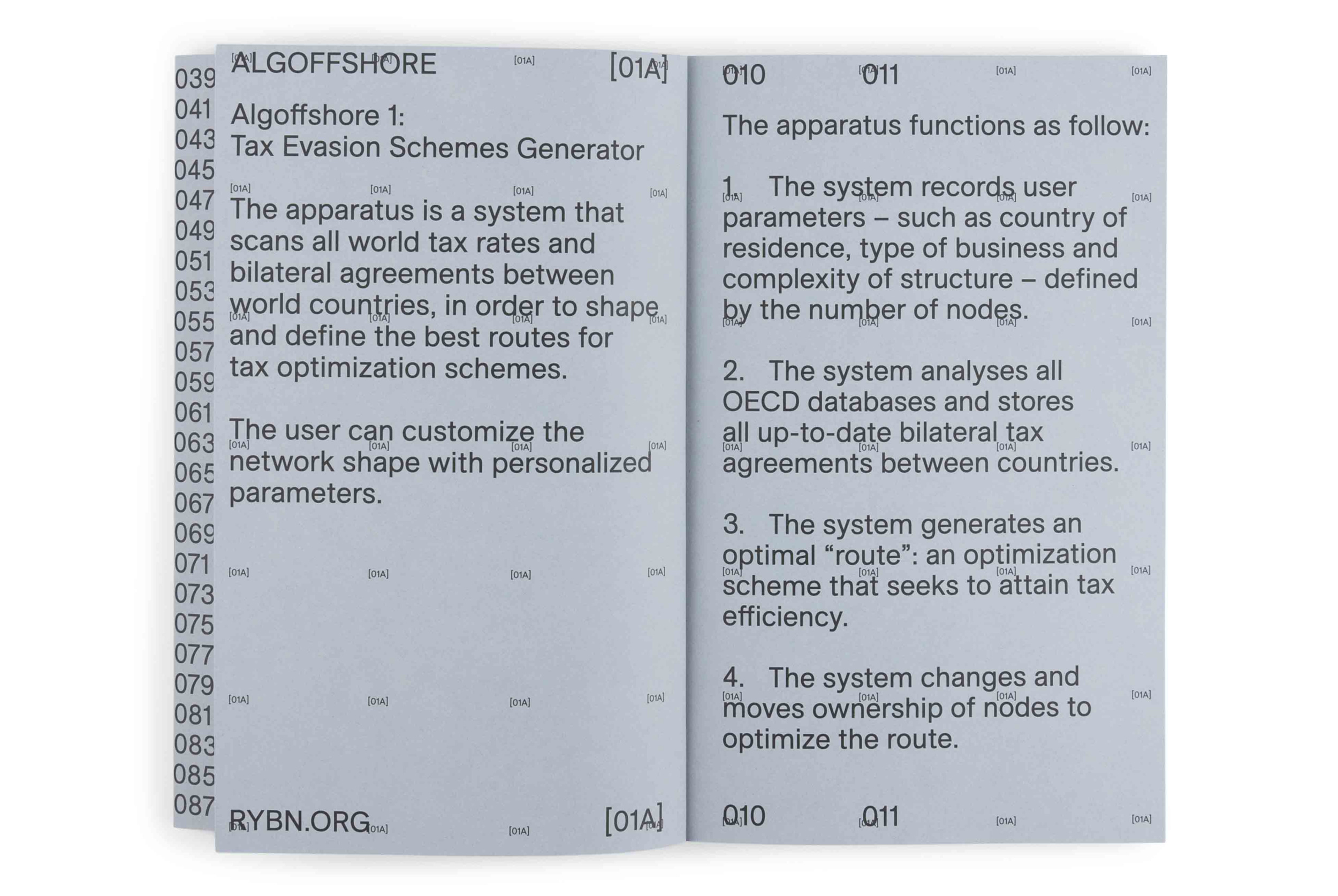 The ALGOFFSHORE series of flowcharts (RYBN.ORG, 2017- 2021) presents five ready-to-use strategies for evading taxes or social and environmental obligations. En passant, these flowcharts document how contemporary financial engineering allows multinationals and enterprises to optimize profits, render transactions opaque, maximize anonymity, and circumvent all kinds of regulations hindering the smooth circulation—and ultimately the accumulation—of capital. As such, the present publication can be seen as a tactical manual for the art of evasion.