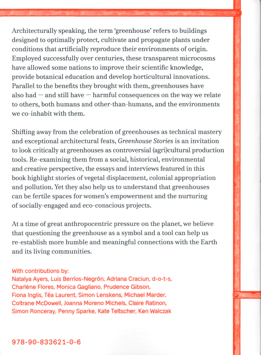 Shifting away from the celebration of greenhouses as technical mastery and exceptional architectural feats, Greenhouse Stories is an invitation to critically look at greenhouses as controversial (agri)cultural production tools. Re-examining them from a social, historical, environmental and creative perspective, the essays and interviews featured in this book highlight stories of vegetal displacement, colonial appropriation and pollution. Yet they also help us to understand that greenhouses can be fertile spaces for women's empowerment and the nurturing of socially-engaged and eco-conscious projects. At a time of great anthropocentric pressure on the planet, we believe that questioning the greenhouse as a symbol and a tool can help us re-establish more humble and meaningful connections with the Earth and its living communities.
