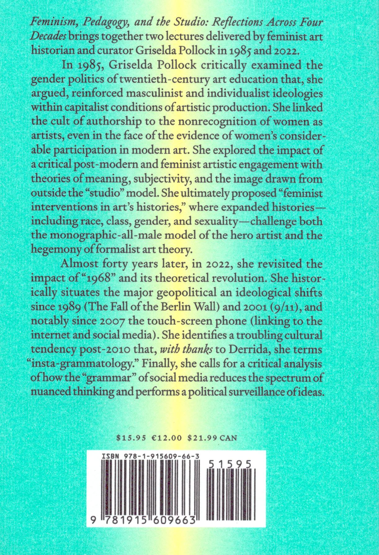 Feminism, Pedagogy, and the Studio: Reflections Across Four Decades brings together two lectures delivered by feminist art historian and curator Griselda Pollock in 1985 and 2022.