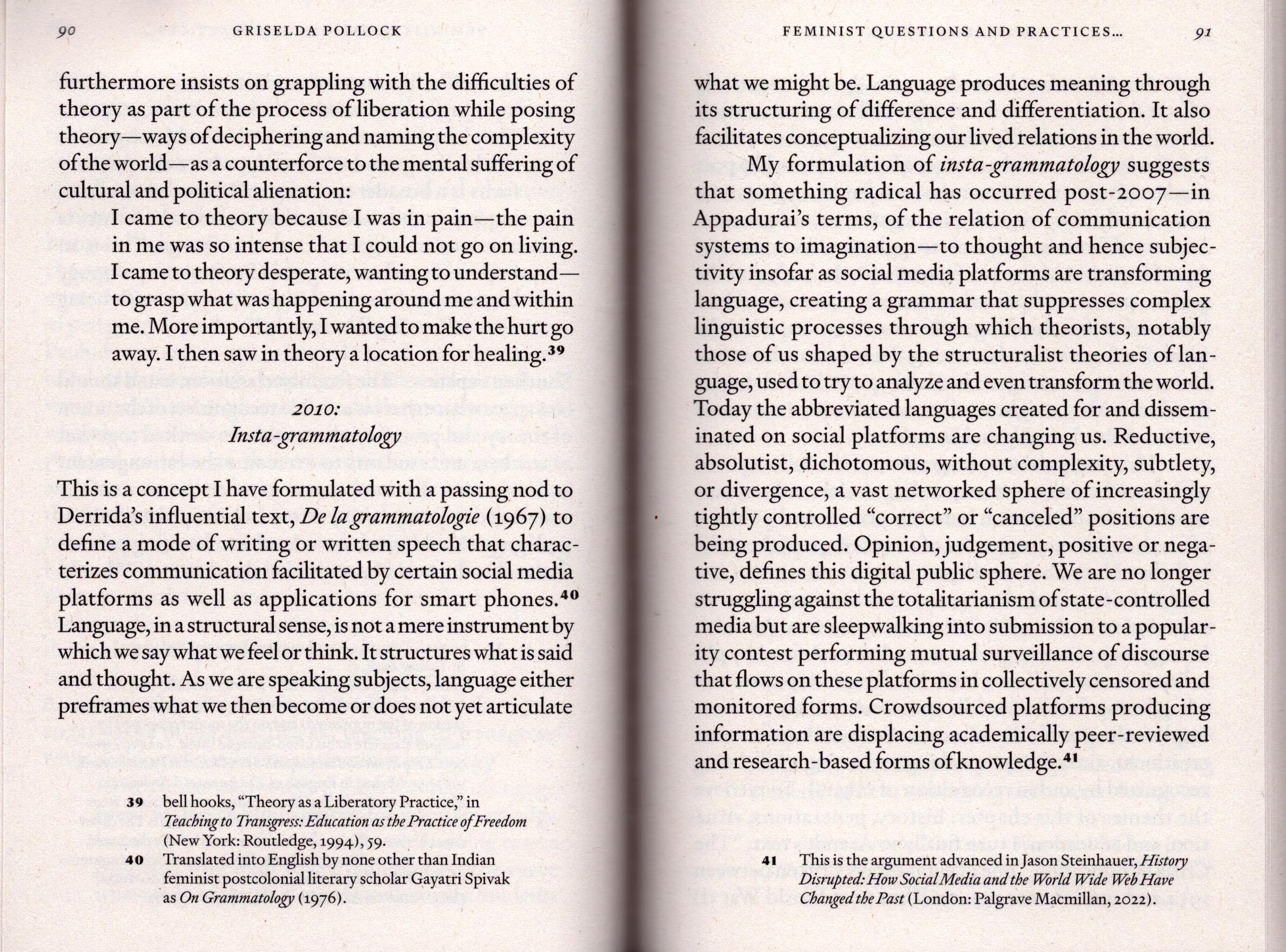 Almost forty years later, in 2022, she revisited the impact of “1968” and its theoretical revolution. She historically situates the major geopolitical and ideological shifts since 1989 (The Fall of the Berlin Wall) and 2001 (9/11), and notably since 2007 the touch-screen phone (linking to the internet and social media). She identifies a troubling cultural tendency post-2010 that, with thanks to Derrida, she terms “insta-grammatology.” Finally, she calls for a critical analysis of how the “grammar” of social media reduces the spectrum of nuanced thinking and performs a political surveillance of ideas.