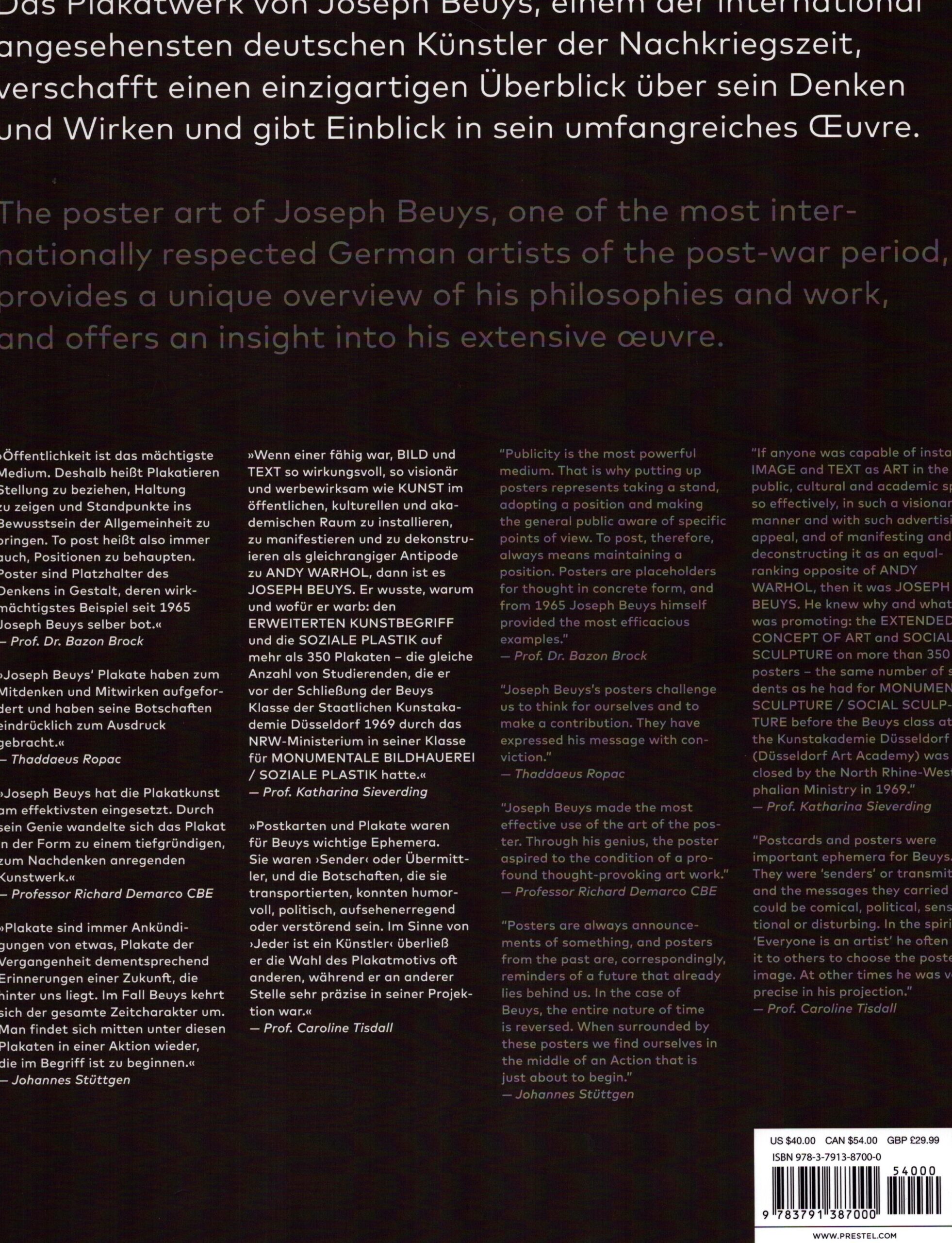 One of the most important German postwar artists, Joseph Beuys is known for his sculpture, performance art, activism, and teaching, influencing a generation of younger artists and expanding the concept of what art is. He had an ambitious goal for his art: to transform Western cutlure into a more peaceful, democratic, and creative place. He also believed that everyone is an artist and that art and life should not be viewed separately. This book pulls together all of the avant-garde artist's posters from his entire oeuvre. His earliest posters often announced exhibitions of his own performance art, while later posters expressed his political opinions mostly in favor of Germany's Green Party, which he was a founder of. This book includes full page illustrations of each poster, essays about Beuys's influence, and an extensive biography of the artist. No other medium expresses Beuys's heartfelt beliefs better than his own posters, which all employ a style of graphic design all his own.