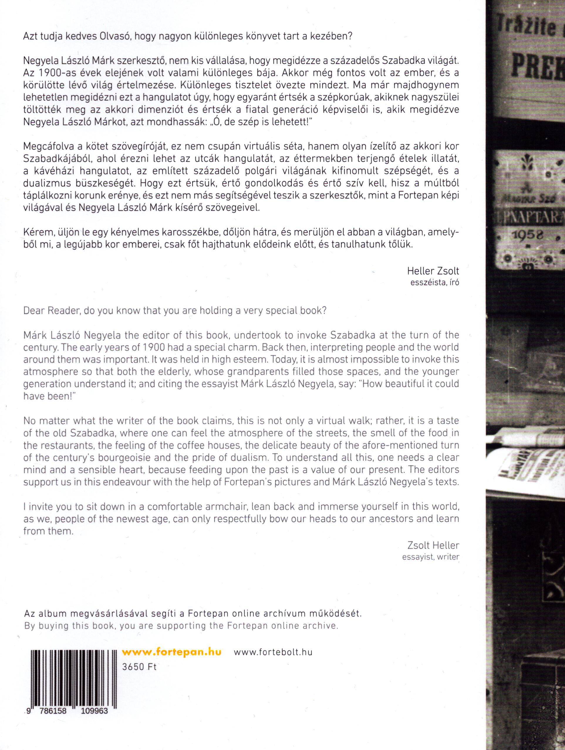 Megcáfolva a kötet szövegíróját, ez nem csupán virtuális séta, hanem olyan ízelítő az akkori kor Szabadkájából, ahol érezni lehetett az utcák hangulatát, az éttermekben terjengő ételek illatát, a kávéházi hangulatot, az említett századelő polgári világának kifinomult szépségét, és a dualizmus büszkeségét. Hogy ezt értsük, értő gondolkodás és értő szív kell, hisz a múltból táplálkozni korunk erénye, és ezt nem más segítségével teszik a szerkesztők, mint a Fortepan képi világával és Negyela László Márk kísérő szövegeivel.