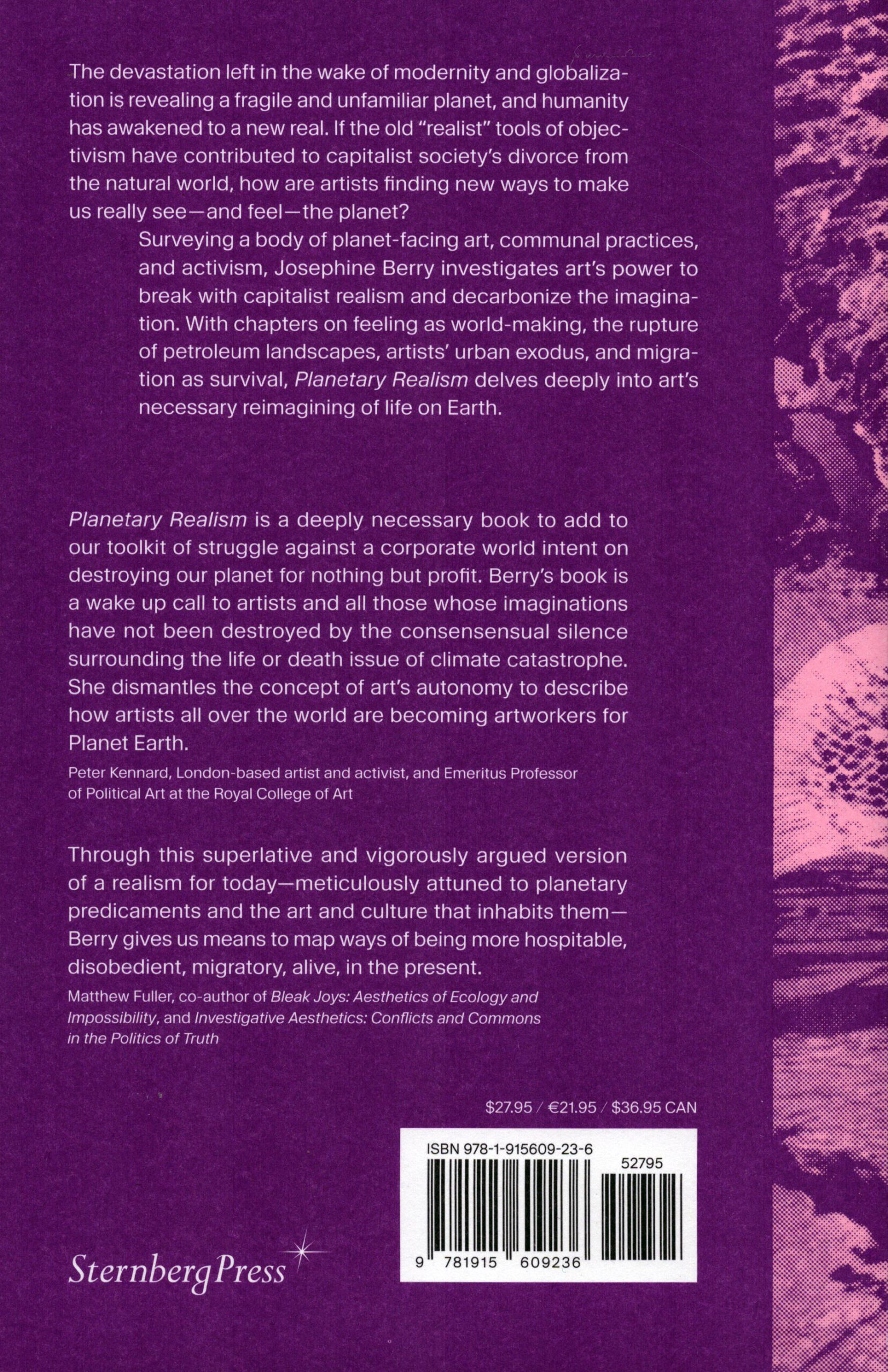 Surveying a body of planet-facing art, communal practices, and activism, Josephine Berry investigates art’s power to break with capitalist realism and decarbonize the imagination. With chapters on feeling as world-making, the rupture of petroleum landscapes, artists’ urban exodus, and migration as survival, Planetary Realism delves deeply into art’s necessary reimagining of life on Earth.