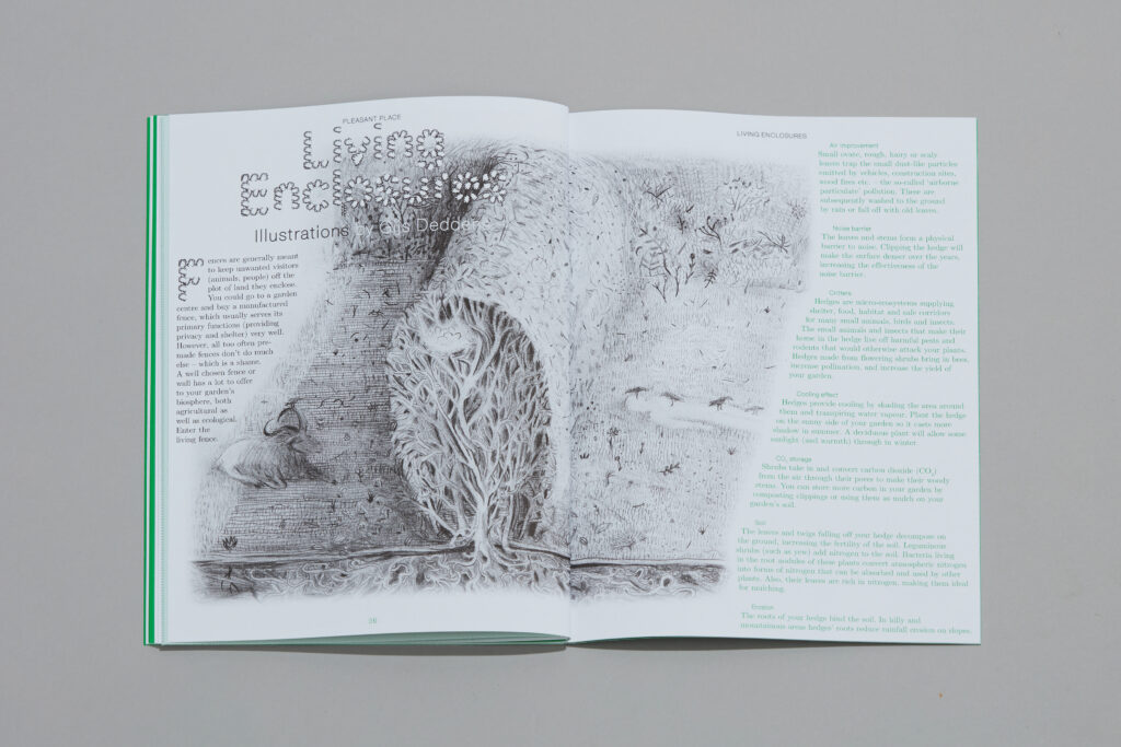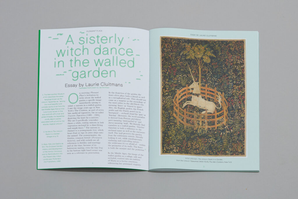 ‘Pleasant Place’ is a growing collection of publications about the art of gardening, offering both practical and in-depth information to everyday garden tasks and garden design. This first issue features essays such as ‘A Sisterly Witch Dance in the Walled Garden’ by Laurie Cluitmans, ‘New Enclosures’ on new experimental enclosures by artists Cindy Bakker, Iede Reckman, Jesse Greulich, and Daniel Slats, a photo-essay on Derek Jarman’s fenceless garden, an article on the benefits of ‘Living Enclosures’ with illustrations by Gijs Deddens, and a set of hortus conclusus miniatures by Sophie Artz.
