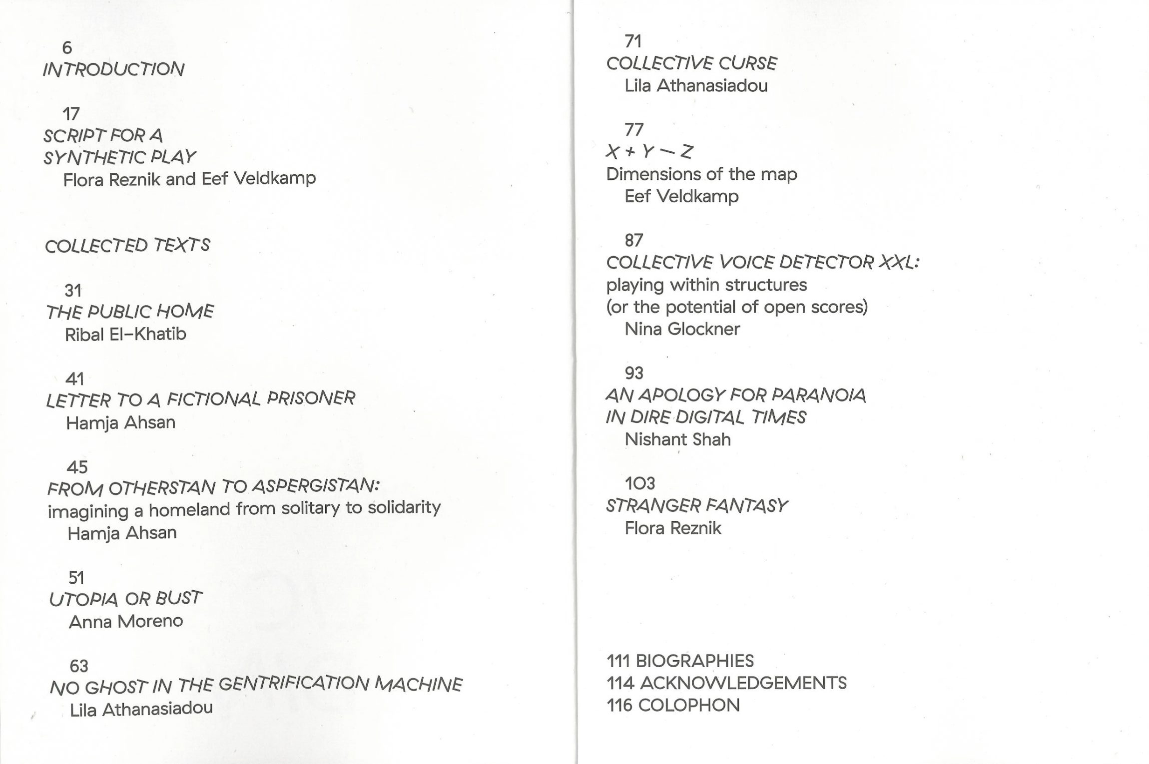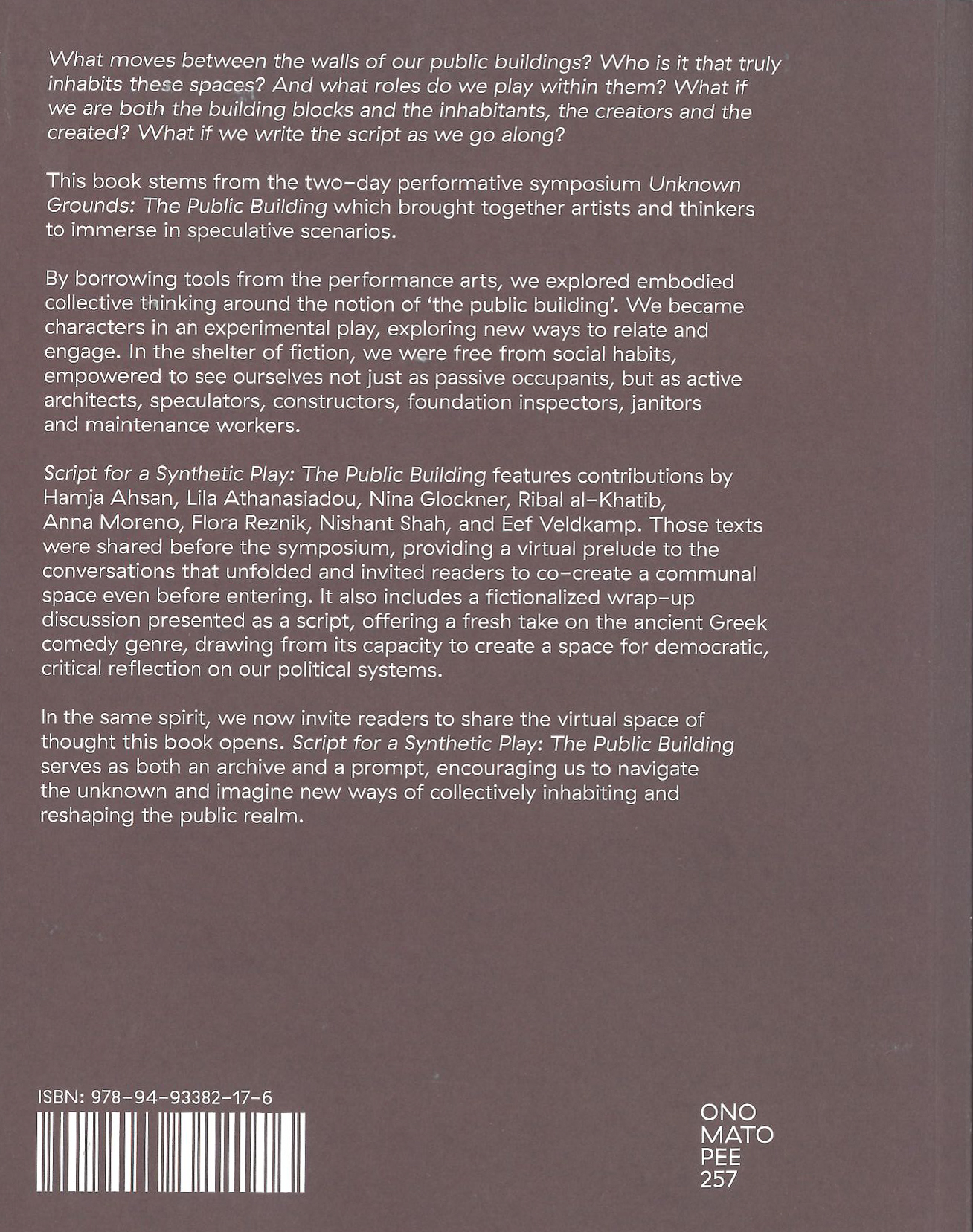 Who inhabits our public buildings, and what roles do we play within them? What if we are both creators and occupants, shaping these spaces as we go? This book stems from Unknown Grounds: The Public Building, a two-day symposium where artists and thinkers reimagined "the public building" through performance and fiction. Participants embodied roles from architects to janitors, exploring how we actively shape the spaces we inhabit. Script for a Synthetic Play: The Public Building features texts by Hamja Ahsan, Lila Athanasiadou, Nina Glockner, and others. It includes a fictionalised wrap-up in the style of Greek comedy, fostering critical reflection on political systems. Both archive and invitation, the book encourages readers to rethink and reshape the public realm.