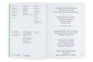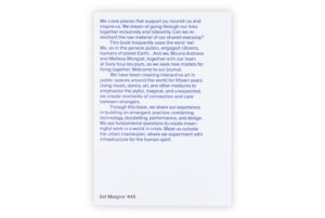 “We” in this book refers both to all of us as citizens of Earth, and to Mouna Andraos and Melissa Mongiat, along with their team at the Montreal-based art and design studio Daily tous les jours, as they explore new ways of living together. It is an invitation into their journal. For over fifteen years, the studio has created interactive public art around the world, using music, movement, and storytelling to spark connection, joy, and care among strangers. Through this book, an evolving practice is shared that blends technology, design, and performance to ask deeper questions and imagine new forms of collective life, beyond the urban masterplan and towards infrastructure for the human spirit.