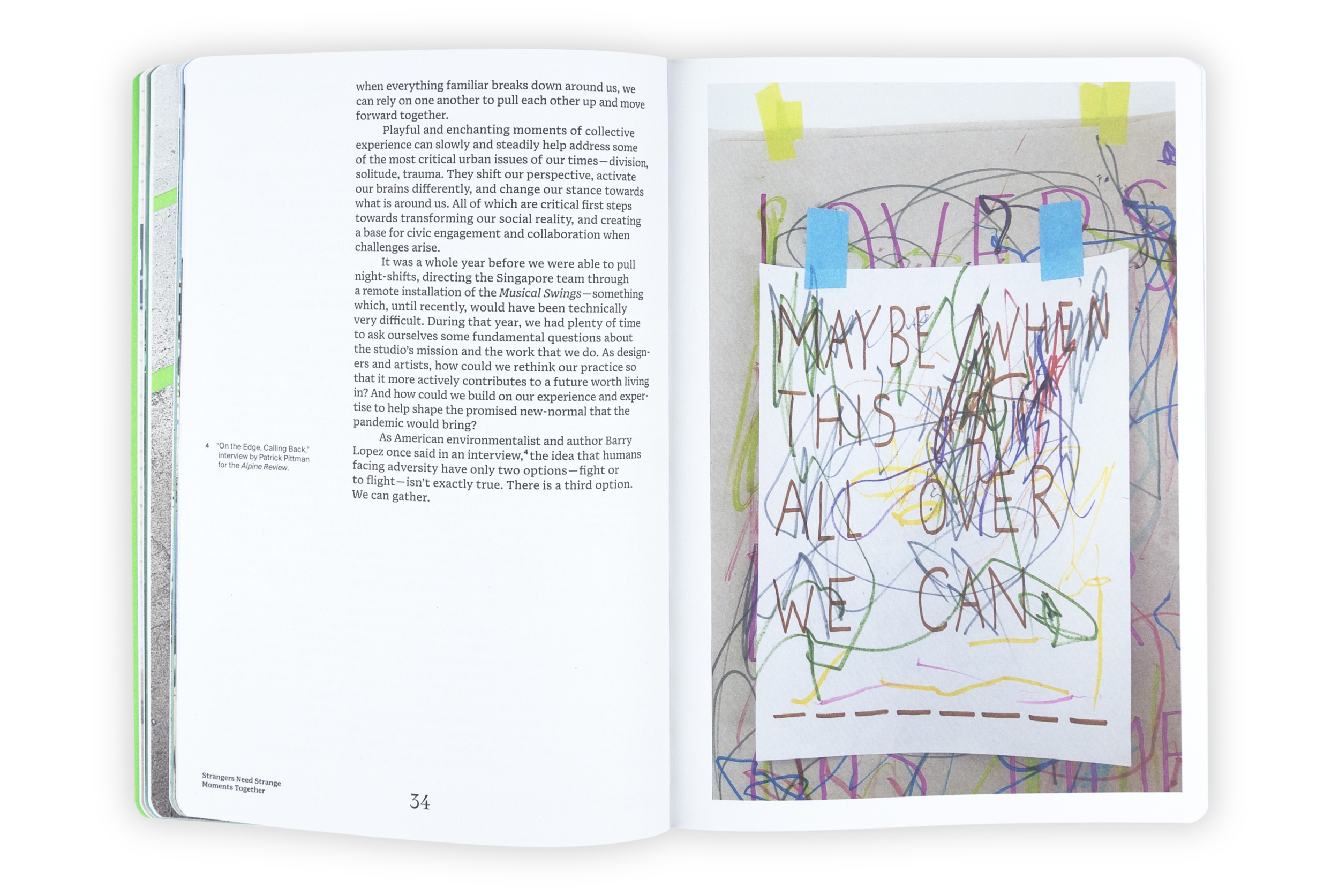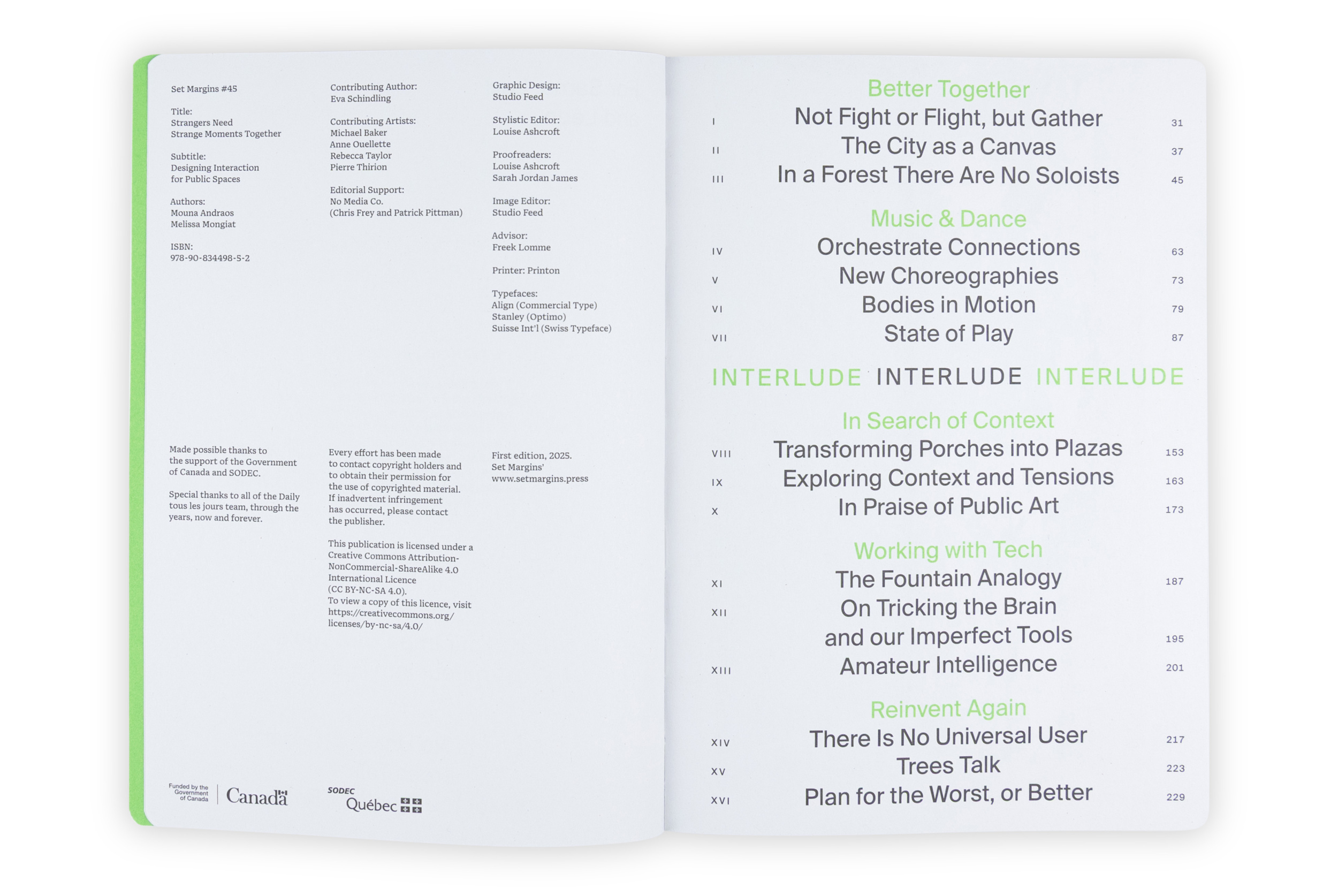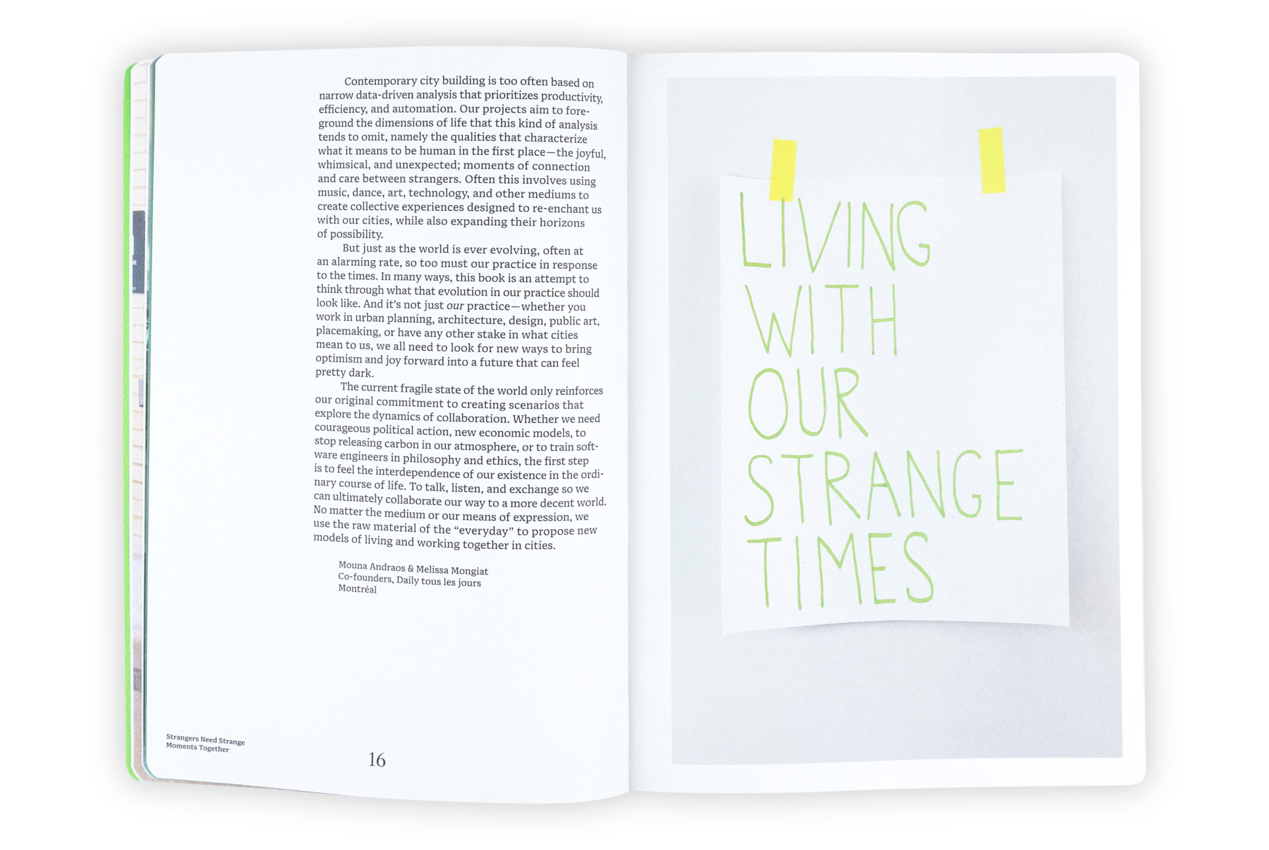 “We” in this book refers both to all of us as citizens of Earth, and to Mouna Andraos and Melissa Mongiat, along with their team at the Montreal-based art and design studio Daily tous les jours, as they explore new ways of living together. It is an invitation into their journal. For over fifteen years, the studio has created interactive public art around the world, using music, movement, and storytelling to spark connection, joy, and care among strangers. Through this book, an evolving practice is shared that blends technology, design, and performance to ask deeper questions and imagine new forms of collective life, beyond the urban masterplan and towards infrastructure for the human spirit.