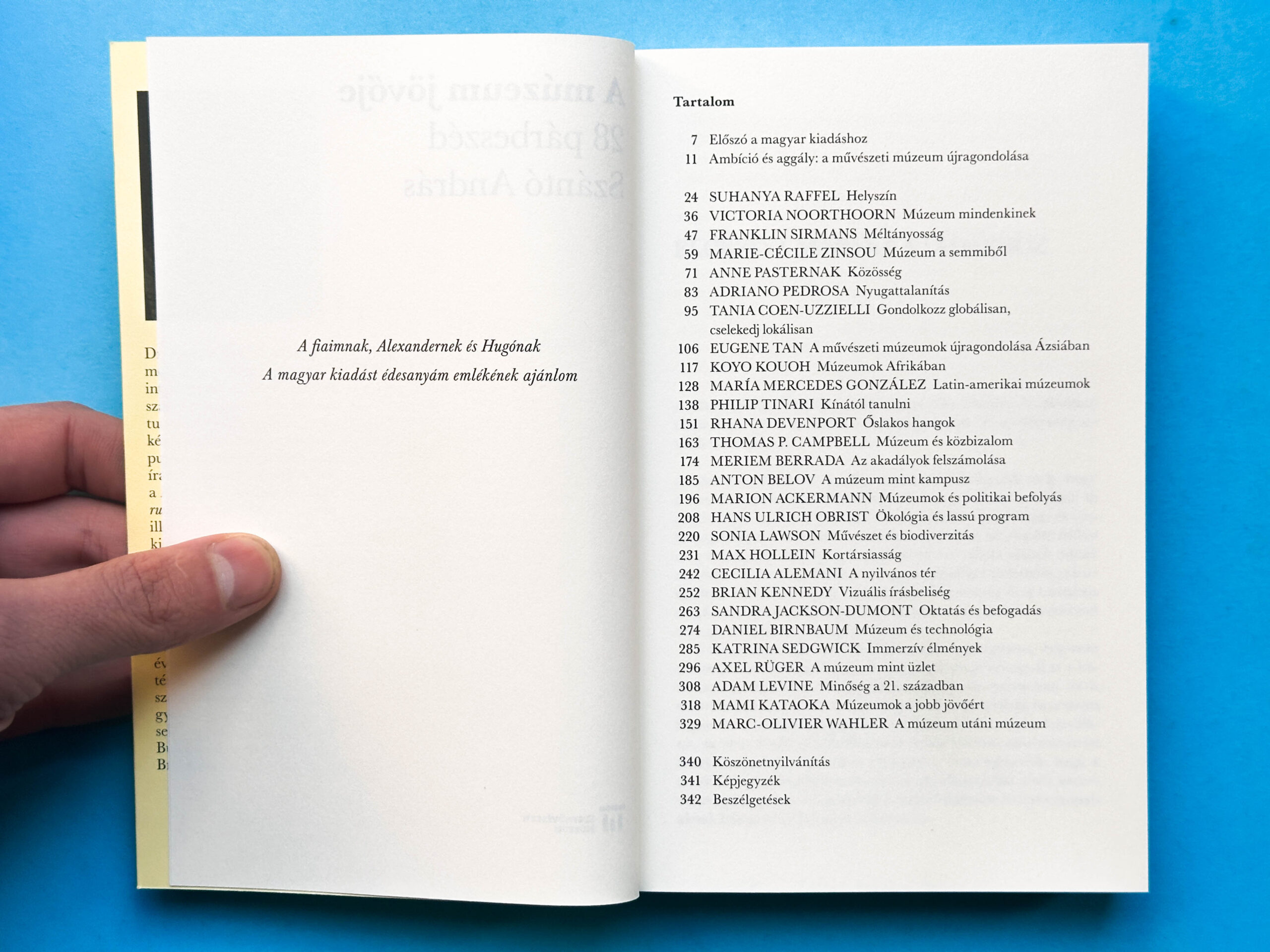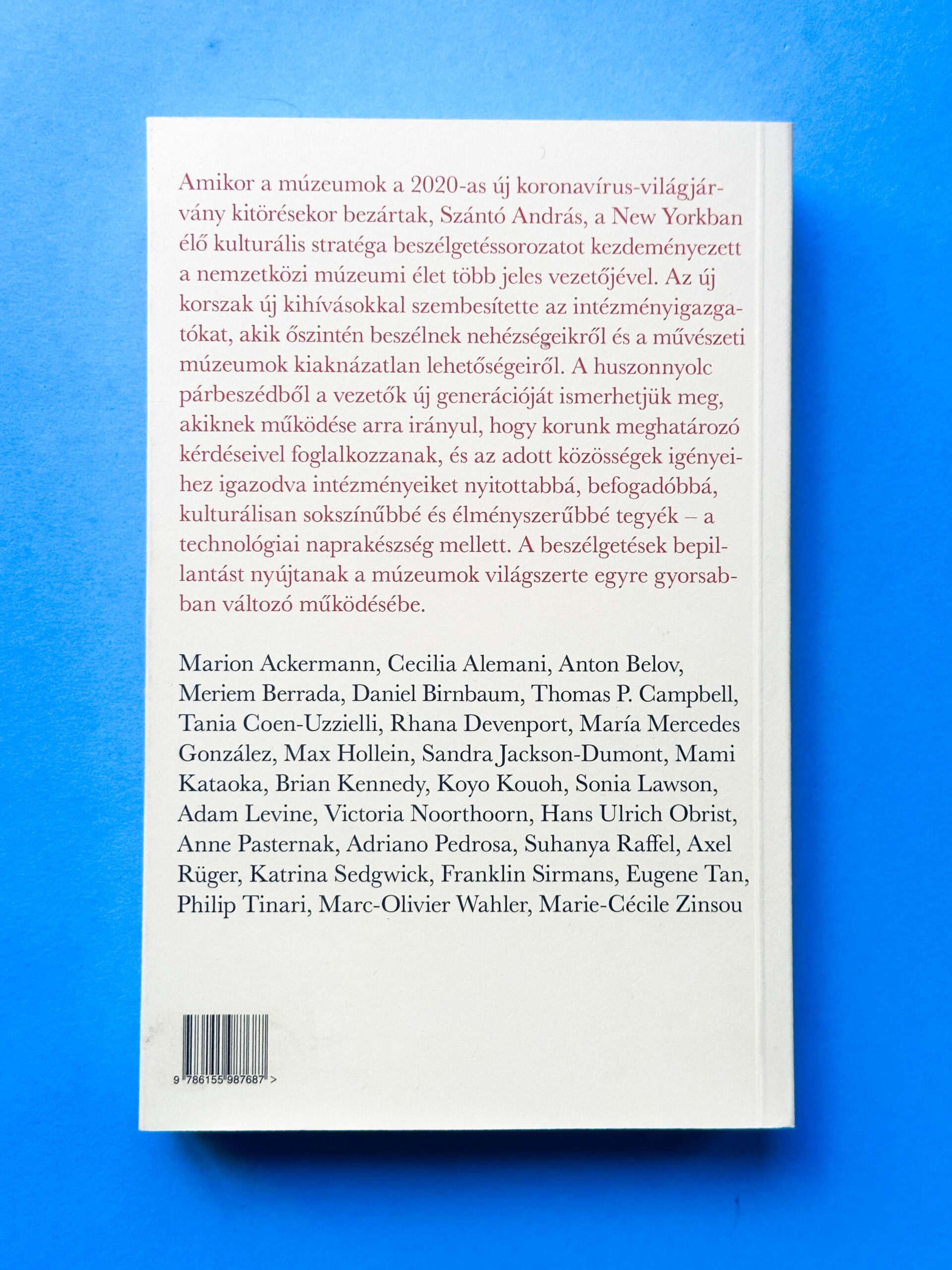 Amikor a múzeumok a 2020-as új koronavírus világjárvány kitörésekor bezártak, Szántó András, a New Yorkban élő kulturális stratéga beszélgetéssorozatot kezdeményezett a nemzetközi múzeumi élet több jeles vezetőjével. Az új korszak új kihívásokkal szembesítette az intézményigazgatókat, akik őszíntén beszélnek nehézségeikről és a művészeti múzeumok kiaknázatlan lehetőségeiről. A huszonnyolc párbeszédből a vezetők új generációját ismerhetjük meg, akiknek működése arra irányul, hogy korunk meghatározó kérdéseivel foglalkozzanak, és az adott közösségek igényeihez igazodva intézményeiket nyitottabbá, befogadóbbá, kulturálisan sokszínűbbé és élményszerűbbé tegyék - a technológiai naprakészség mellett. A beszélgetések bepillantást nyújtanak a múzeumok világszerte egyre gyorsabban változó működésébe.