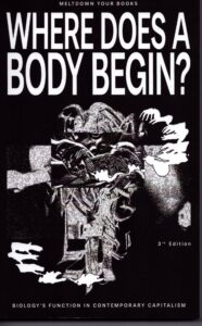 This is a limited run printing of a book entitled "Where does a body begin? Biology's Function in Contemporary Capitalism", written anonymously by the infamous "Meltdown Your Books" a.k.a "S.R.", who has written this book as a part of her Ph.D studies in Evolutionary Biology (with a focus on Mathematical modelling).